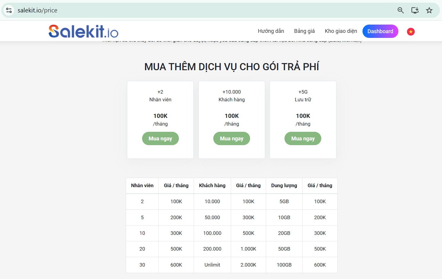 Ngoài ra, bạn có thể mua thêm nhân viên, khách hàng, dung lượng để sử dụng trong gói trả phí của mình.