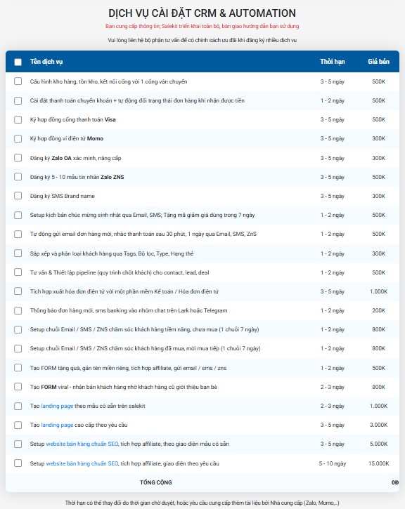 Salekit có dịch vụ cài đặt tính năng theo yêu cầu có biểu phí đính kèm: