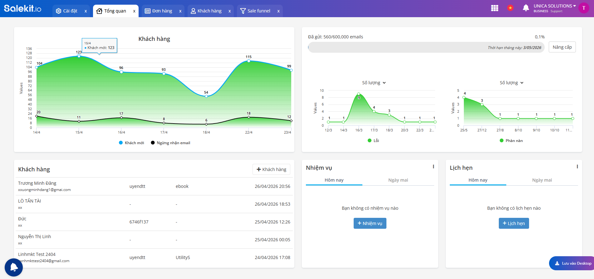 - Hệ thống Email Marketing Automation mạnh mẽ: Đối với B2B, việc nuôi dưỡng lead là cực kỳ quan trọng. Salekit.io giúp bạn thiết lập các kịch bản chăm sóc tự động qua Email, Zalo hoặc SMS. Ví dụ, ngay sau khi khách hàng tải Ebook, hệ thống sẽ tự động gửi email cảm ơn, sau đó 2 ngày gửi thêm tài liệu chuyên sâu và sau 5 ngày mời tham gia buổi Demo. Quá trình này diễn ra hoàn toàn tự động, giúp bạn duy trì sự hiện diện liên tục trong tâm trí khách hàng.