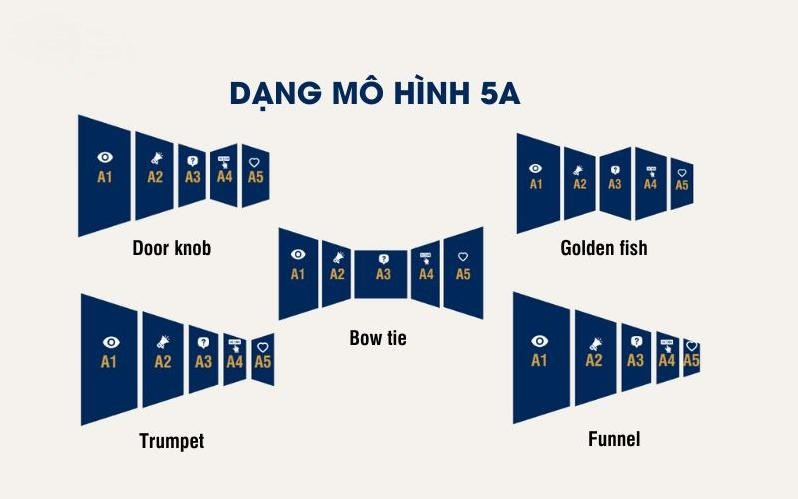 Mô hình 5A cung cấp một khung nhìn tổng quát, nhưng hành trình thực tế của khách hàng có thể đa dạng tùy thuộc vào ngành hàng, sản phẩm và đối tượng mục tiêu. Dưới đây là 5 dạng hành trình khách hàng phổ biến được mô tả trong mô hình 5A :