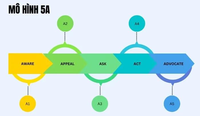 Mô hình 5A là một khung lý thuyết mô tả hành trình khách hàng trong kỷ nguyên số, bao gồm năm giai đoạn chính: Awareness (Nhận biết), Appeal (Thu hút), Ask (Tìm hiểu), Act (Hành động), và Advocate (Ủng hộ). Khác với các mô hình tuyến tính trước đây, 5A phản ánh một hành trình phi tuyến tính, nơi khách hàng có thể tương tác với thương hiệu ở nhiều điểm chạm khác nhau, chịu ảnh hưởng bởi cả yếu tố cá nhân và cộng đồng.